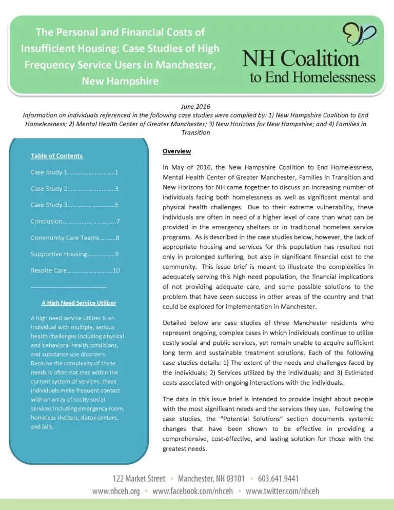The Personal and Financial Costs of Insufficient Housing details how insufficient housing in NH creates high frequency service users.  The report, which was a joint effort by the NHCEH, the Mental Health Center of Greater Manchester, Families in Transition and New Horizons for NH, concludes with recommendations on reducing high utilizers, including implementing multi-disciplinary team of service providers, such as Community Care Teams, to manage complex cases, increasing supportive housing program, and expanding respite care options.